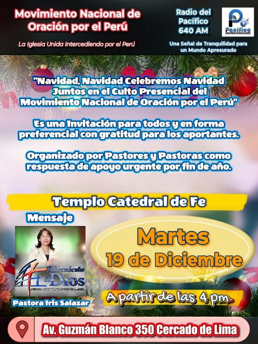 Juntos en el Culto Presencial del Movimiento de Oración, el día martes 19 de Diciembre a las 4pm. en el templo Catedral de Fe, es una Invitación para todos y en forma presencial con gratitud para los aportantes. Organizado por Pastores y pastoras como respuesta de apoyo urgente por fin de año. Movimiento de Oración por el Perú, Amor Fe y Esperanza. SHALOM